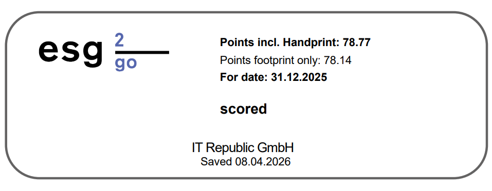 Die IT Republic GmbH setzt sich aus Überzeugung für Klima- und Umweltschutz ein. Als Mitglied der Klima Charta Zug+ bekennen wir uns zur aktiven Reduktion von CO2-Emissionen. Wir verfügen über ein aktuelles ESG-Rating nach esg2go (Selbstdeklaration, Stand 2026).
